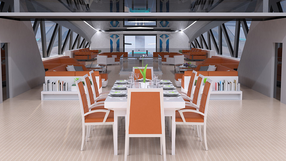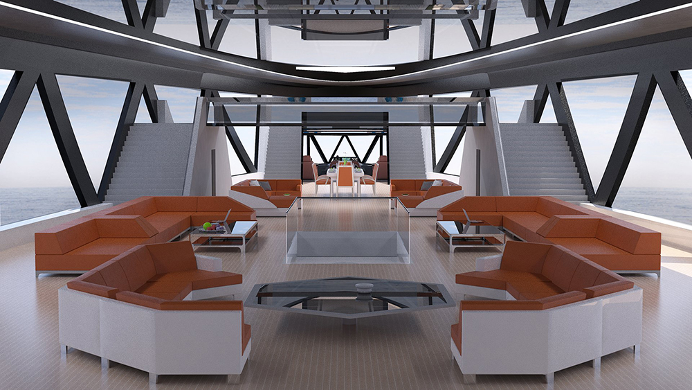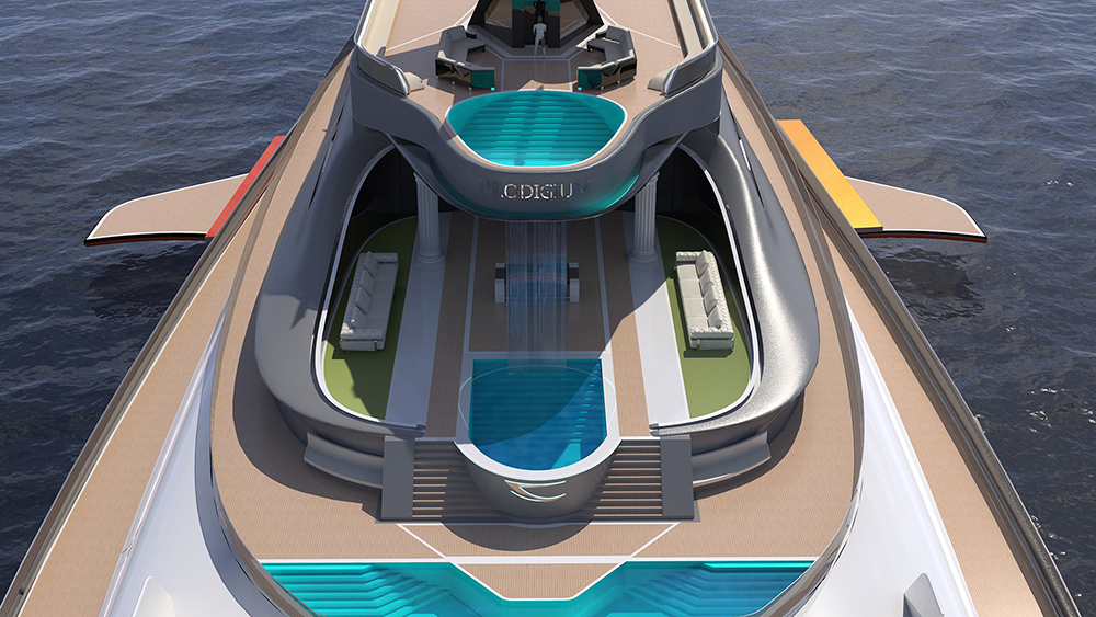 Prodigium features no less than six different decks. The upper level was designed specifically to resemble a shark and comprises the main living area. That’s right, you’ll be relaxing in the belly of the beast. The vessel is forged from carbon fiber and aluminum, and features a pointed nose, a gray colorway and a series of diagonal lines that are reminiscent of teeth.